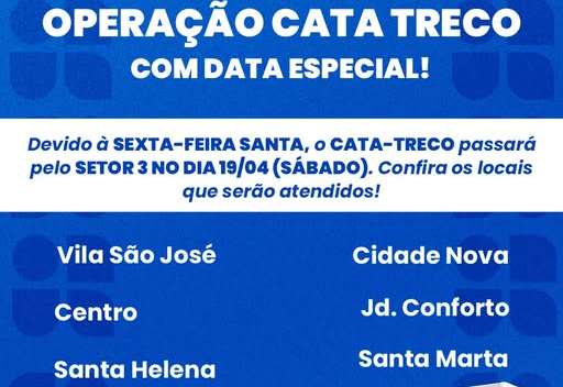 Hoje (07), o caminhão do Cata-Treco passará pelo Setor 1 para a coleta de inservíveis. Confira os locais que serão atendidos e lembre-se de deixar os inservíveis na calçada para evitar obstruções nas vias.