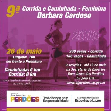 A Prefeitura de Bom Jesus dos Perdões abriu as inscrições para a 9ª Corrida e Caminhada Barbara Cardoso que será realizada no dia 26 de maio, às 16h. As inscrições podem ser feitas pelo site www.bjperdoes.sp.gov.br ou pela Secretaria de Esportes, até o dia 18 de maio. No dia da corrida é obrigatório levar 1kg de alimento não perecível. A corrida é exclusiva para mulheres e as vagas são limitadas. Participe.
