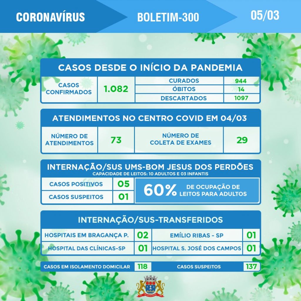 O 14° óbito por Covid-19 de Bom Jesus dos Perdões é de uma senhora de 96 anos, ocorrido no dia 28/02.