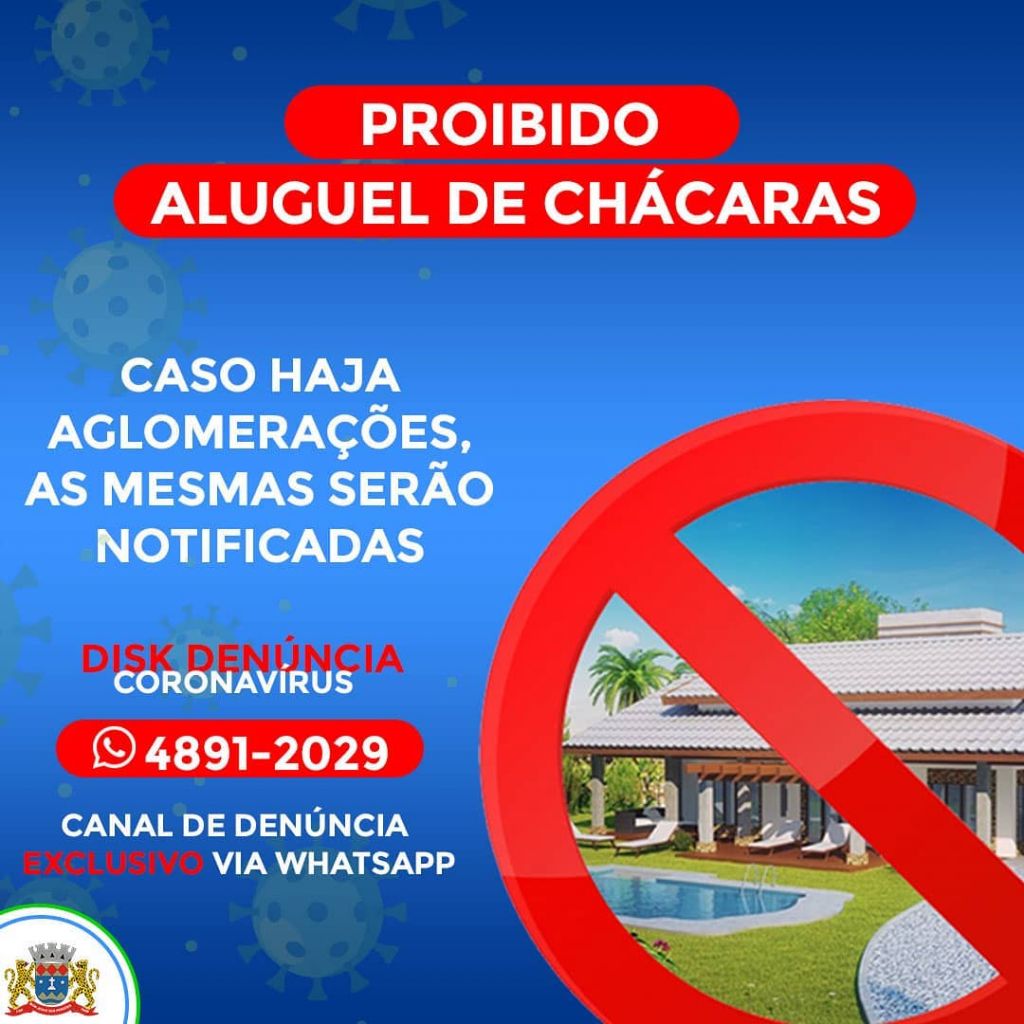 Está proibido o aluguel de chácaras e caso haja aglomerações, as mesmas serão notificadas.