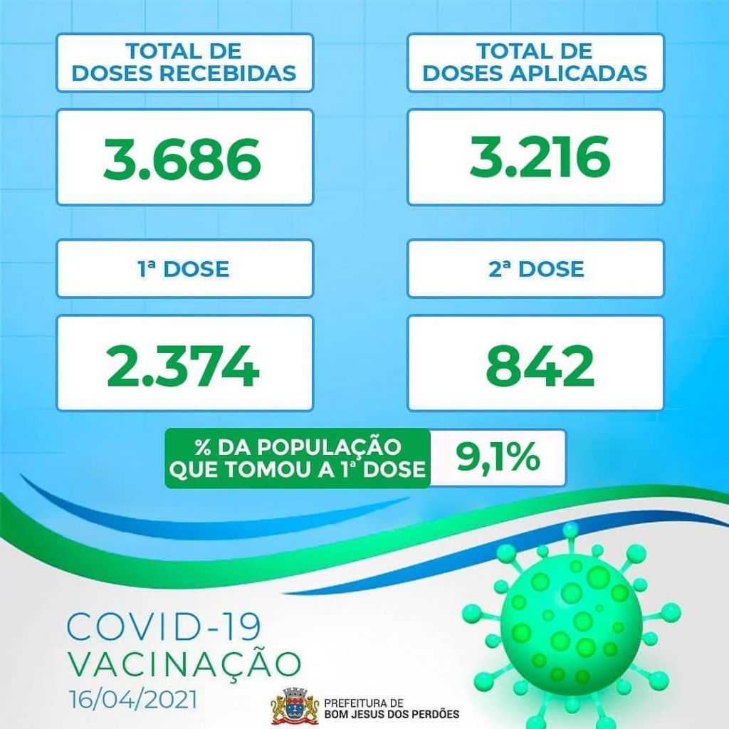 Bom Jesus dos Perdões já aplicou 3.216 doses da vacina contra a Covid-19, equivalente a 9,1% da população.