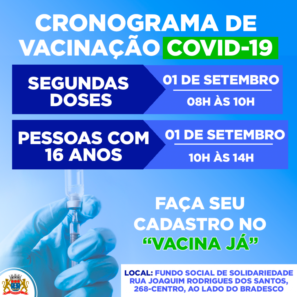 Nessa quarta-feira, das 08 às 10h teremos aplicação apenas de segundas doses. Das 10 às 14h, iremos continuar a vacinação das pessoas com 16 anos de idade.
