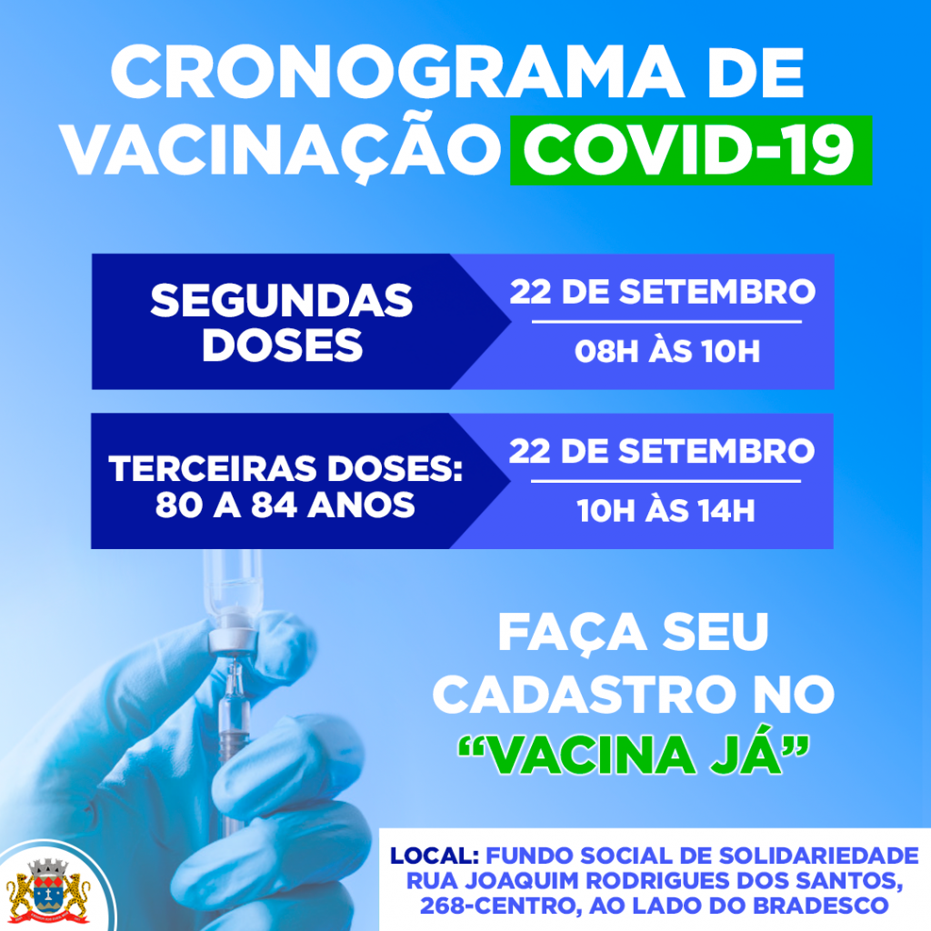 Amanhã (22) das 08 às 10h aplicaremos segundas doses, das 10 às 14h continuaremos a aplicação das terceiras doses aos idosos dos 80 aos 84 anos de idade.