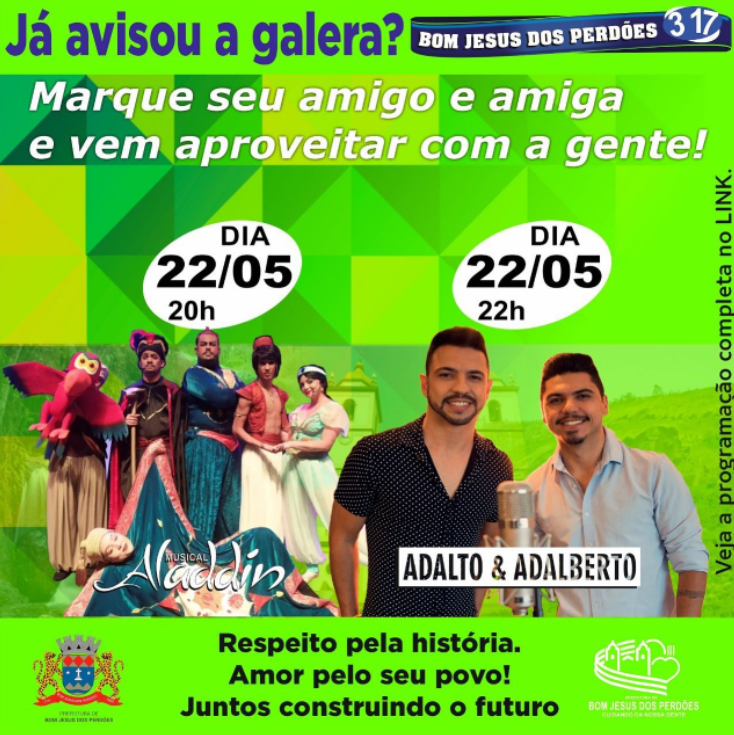 Temos diversas atrações para esta comemoração, veja a programação para não perder nada: https://www.facebook.com/prefeiturabjperdoes/photos/a.2971793372875383/5016801145041252/