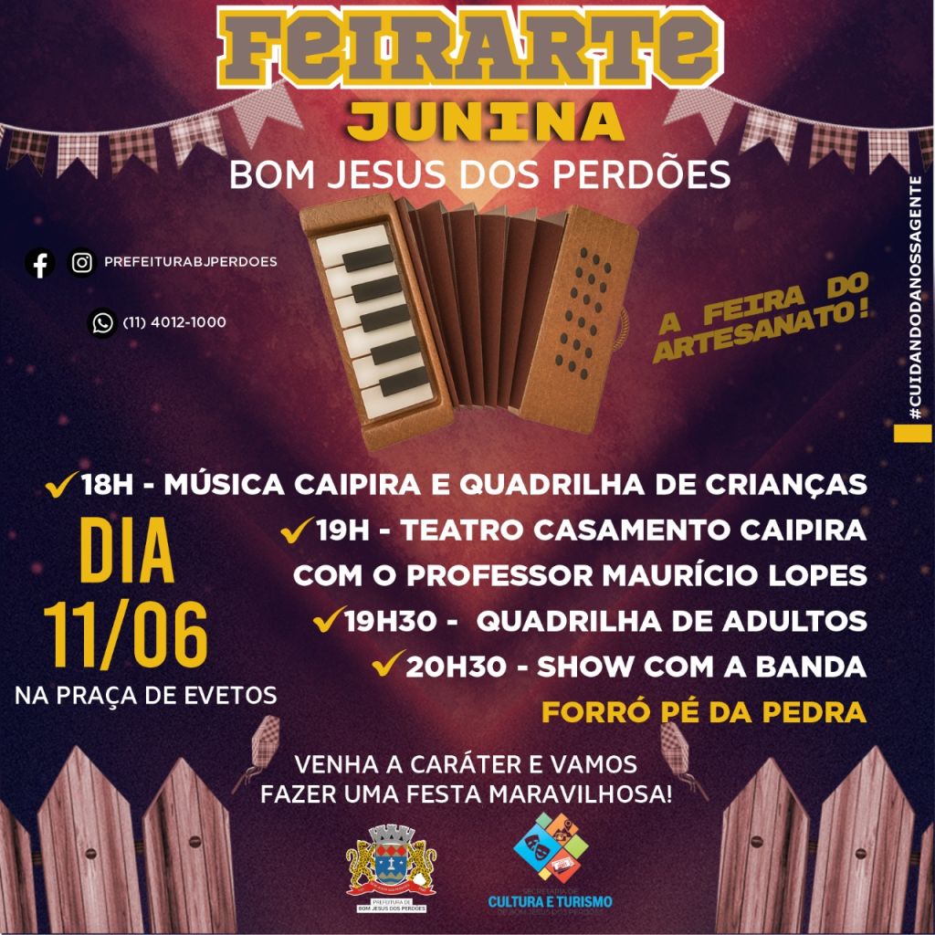 A Prefeitura de Bom Jesus dos Perdões, através da Secretaria de Cultura e Turismo anunciam mais uma edição da FeirArte, que acontecerá na Praça de Eventos. Venha a caráter (festa junina), e vamos nos divertir!