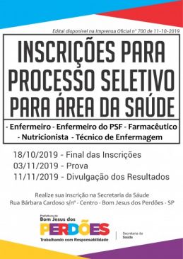 As inscrições começam hoje, dia 16/10, e vão até o dia 18/10 e podem ser realizadas na sede da Secretaria da Sáude na rua Bárbara Cardoso, s/nº – Centro.