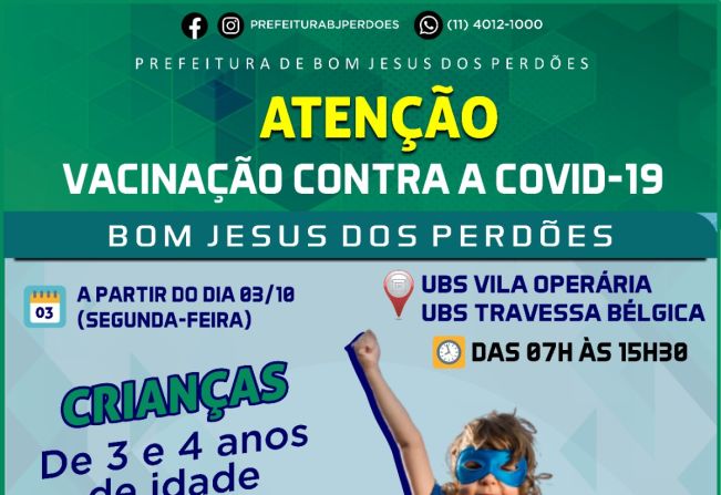 A partir do dia 03/10 (segunda-feira), terá inicio a vacinação contra a covid-19 de crianças de 3 e 4 anos de idade, na UBS Travessa Bélgica e Vila Operária, das 07 às 15:30h.