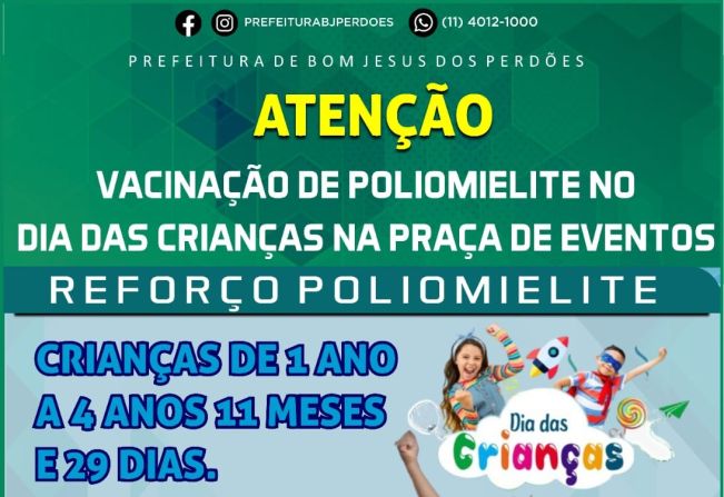 A Secretaria de Saúde informa que no dia 12 de outubro (quarta-feira), estará presente na festividade do dia das crianças na Praça de Eventos, realizando a vacinação de reforço da Poliomielite para crianças de 1 ano a crianças de 4 anos 11 meses e 29 dias de idade.