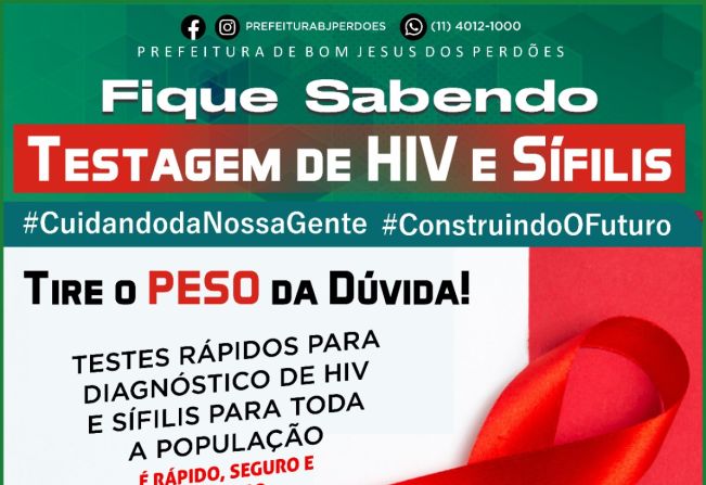 Neste sábado, 10, na Praça de Eventos de Bom Jesus dos Perdões irão acontecer testes rápidos para diagnóstico de HIV e sífilis para toda a população, das 08h às 16h.
