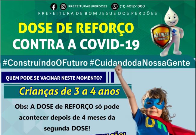 A Prefeitura de Bom Jesus dos Perdões, através da Secretaria de Saúde, informam que a dose de reforço da vacina contra a Covid-19 está disponível para crianças de 3 a 4 anos de idade.