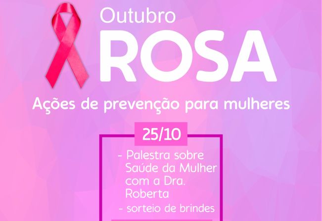Dia 25 de outubro às 13h, na UBS Centro teremos palestra com a Dra. Roberta sobre saúde da mulher além de sorteio de Brindes.