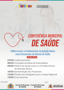 O Conselho Municipal de Saúde em conjunto com a Secretaria de Saúde convida toda a população para participar da 3ª Conferência Municipal de Saúde. Com o tema “Política Local e o Fortalecimento da Atenção Básica como Estruturante do Sistema de Saúde”, o evento será realizado no dia 05 de abril (sexta-feira) a partir das 08h na Câmara Municipal.