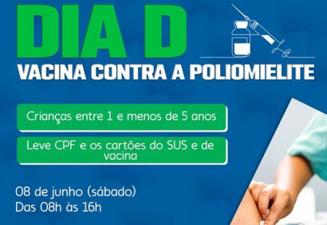 O Dia D da vacinação contra a poliomielite ocorrerá neste sábado (08) na UBS Centro, UBS Travessa Bélgica e na UBS Vila Operária, das 08h às 16h.