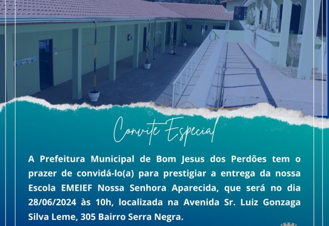 A Prefeitura Municipal de Bom Jesus dos Perdões tem o prazer de convidá-lo(a) para prestigiar a entrega da nossa Escola EMEIEF Nossa Senhora Aparecida, que será no dia 28/06/2024 às 10h, localizada na Avenida Sr. Luiz Gonzaga Silva Leme, 305 Bairro Serra Negra.
