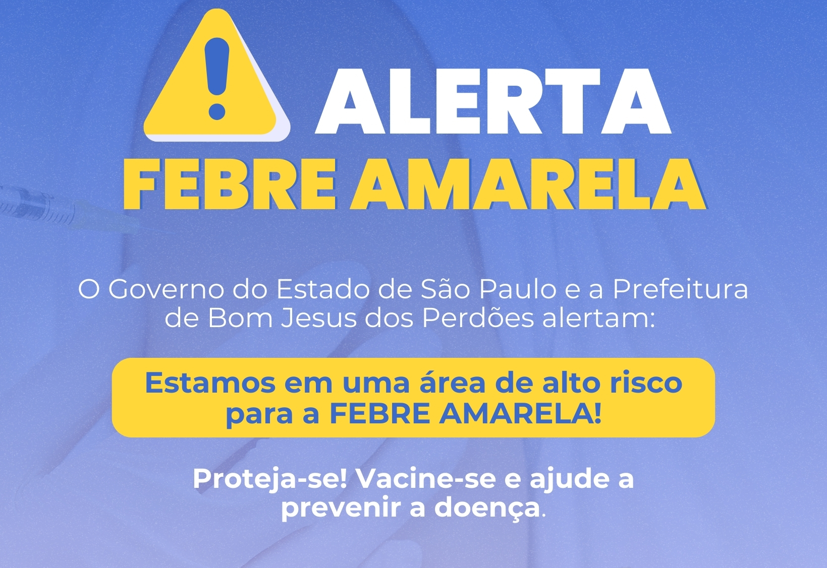 O Governo do Estado de São Paulo e a Prefeitura de Bom Jesus dos Perdões alertam: estamos em uma área de alto risco para a FEBRE AMARELA .