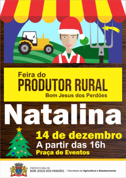 A feira do produtor rural de Bom Jesus dos Perdões terá edição especial de Natal. No próximo sábado, 14, haverá a comercialização de produtos durante toda a programação de festas. Eles ficarão com suas bancas no centro da cidade.