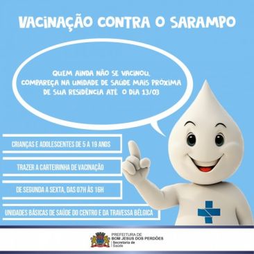 Lembrando a todos que a Prefeitura de Bom Jesus dos Perdões e o Ministério da Saúde continuam com a Campanha de Vacinação contra o Sarampo para crianças e adolescentes de 5 a 19 anos.