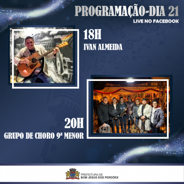 É daqui a pouco!! Após a live do prefeito Sérgio Ferreira, estaremos ao vivo com Ivan Almeida que dará início às nossas apresentações em comemoração aos 315 anos de Bom Jesus dos Perdões. Logo em sequência, o show fica por conta Grupo de choro 9° menor