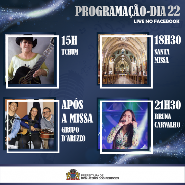As atrações continuam! Hoje (22) às 15h estaremos ao vivo com Tchum. A Santa Missa será as 18h30 e logo após, teremos a apresentação do Grupo D'arezzo. Em seguida, Bruna Carvalho encerra as comemorações do dia a partir das 21h30. Participe!