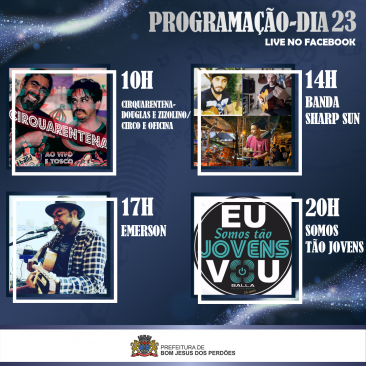 Hoje tem mais diversão!!!! Venha curtir com a gente a programação de mais um dia das lives em comemoração ao aniversário de Bom Jesus dos Perdões. Confere aí a programação e participe!!!