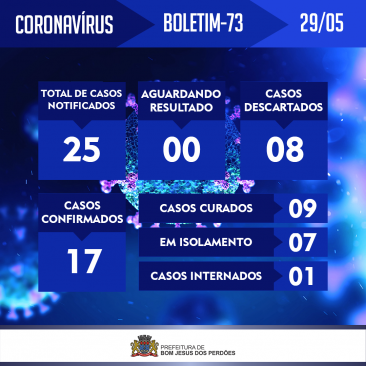 Boletim - 29/05 Bom Jesus dos Perdões tem mais um caso confirmado de Coronavírus. O paciente está em isolamento domiciliar. Com isso, temos 17 casos confirmados. Fiquem em casa, lavem as mãos e se for necessário sair, utilize a máscara. #JuntosSomosM
