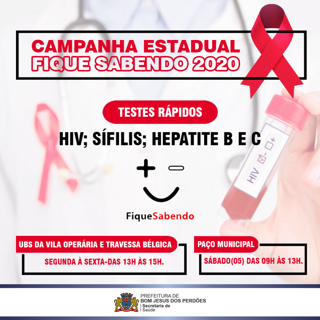 A secretaria Municipal de Saúde realiza a Campanha Estadual Fique Sabendo 2020 de 1 a 7 de dezembro, com oferta de teste rápido de HIV, Sífilis, Hepatites B e C.